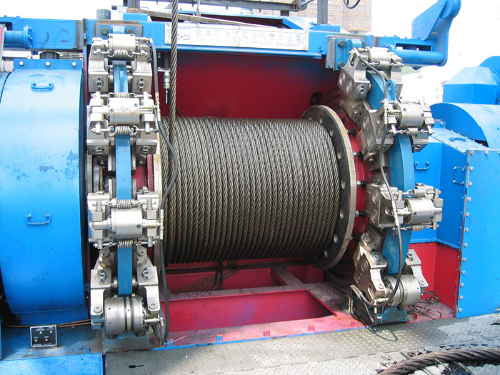 PS系列盤式剎車裝置由三部分組成:制動執(zhí)行機(jī)構(gòu)、液壓站及操作臺,它們之間用液壓管線連接。液壓站是動力源,為執(zhí)行機(jī)構(gòu)提供必須的液壓動力; 操作臺是動力控制操作裝置;執(zhí)行機(jī)構(gòu)是制動執(zhí)行部分,它由剎車鉗、鉗架、剎車盤三部分組成,其中剎車鉗又分為常開式工作鉗和常閉式安全鉗兩種型式。